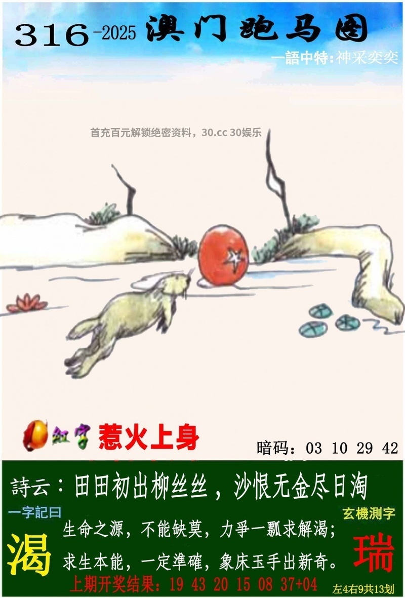 【316期一字記曰】【渴】 生命之源,不能缺莫,力爭一瓢求解渴;求生本能,一定準確,象床玉手出新奇。【瑞】 【精解】:沙恨无金尽日淘:尽日淘解日肖蛇马兔龙羊猴 【生肖皇六肖】蛇马兔龙羊猴 |